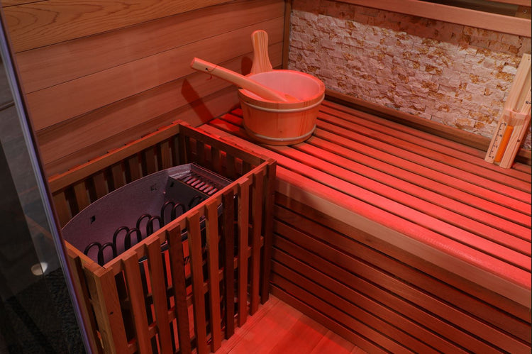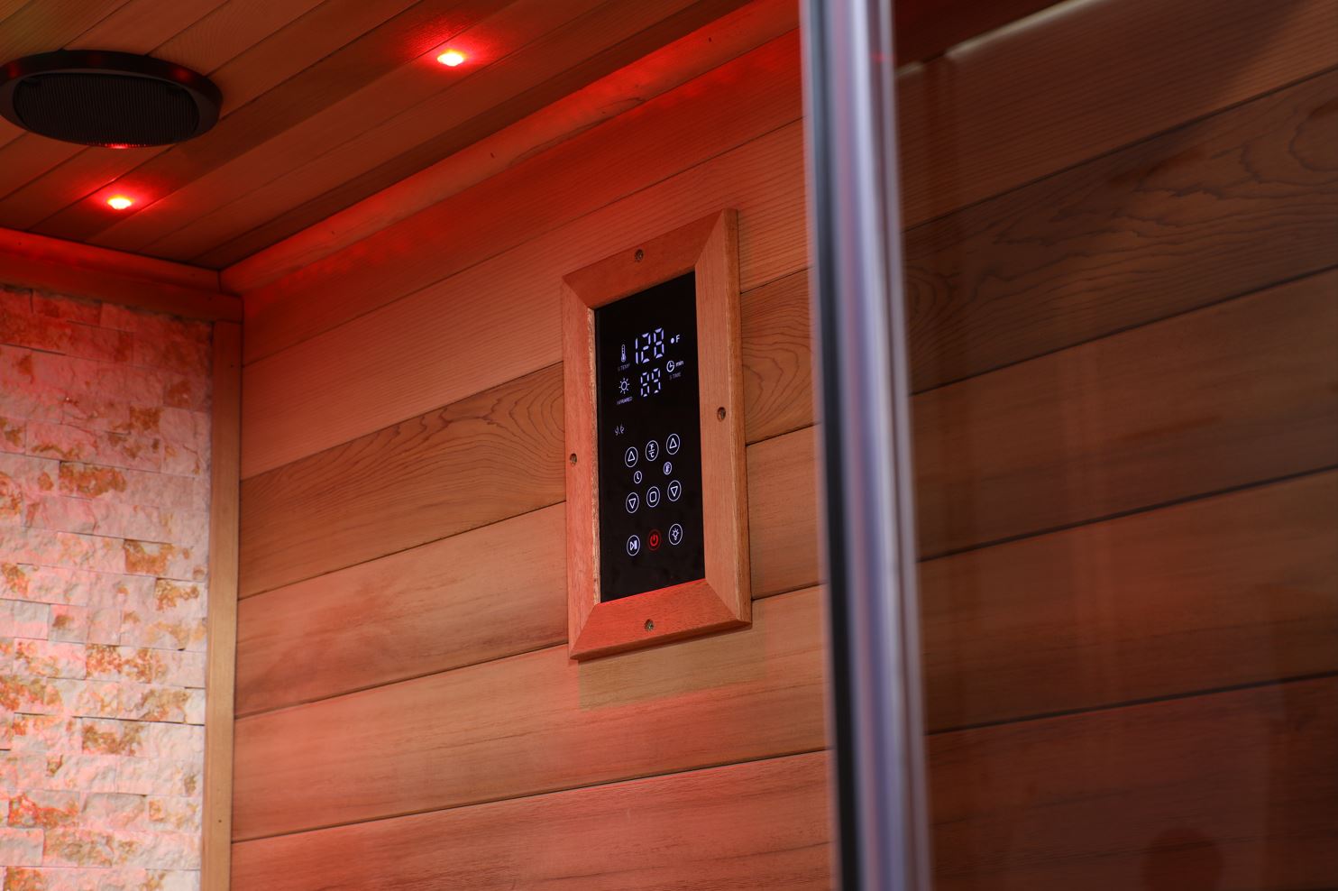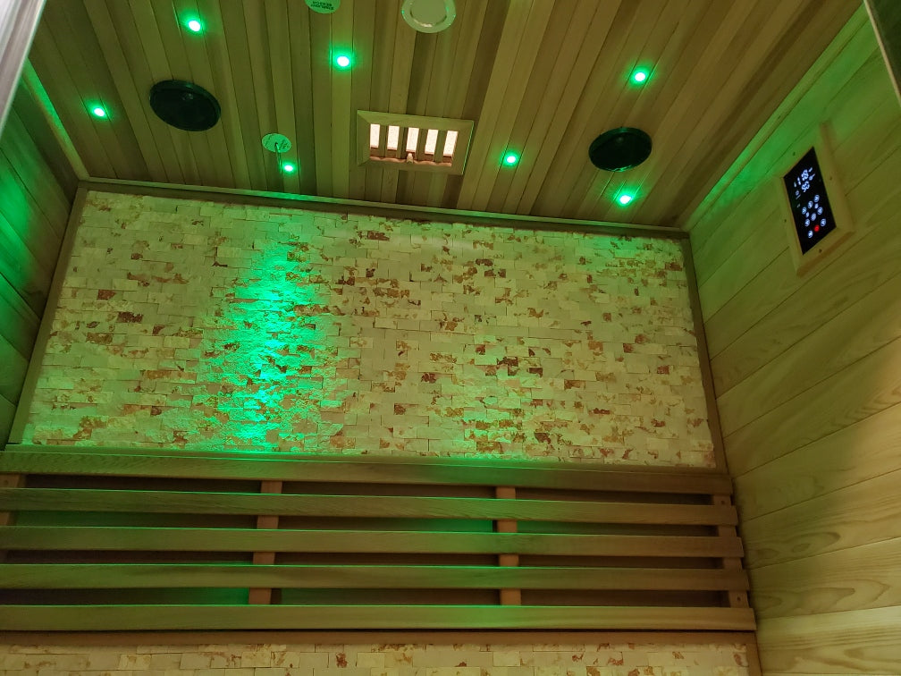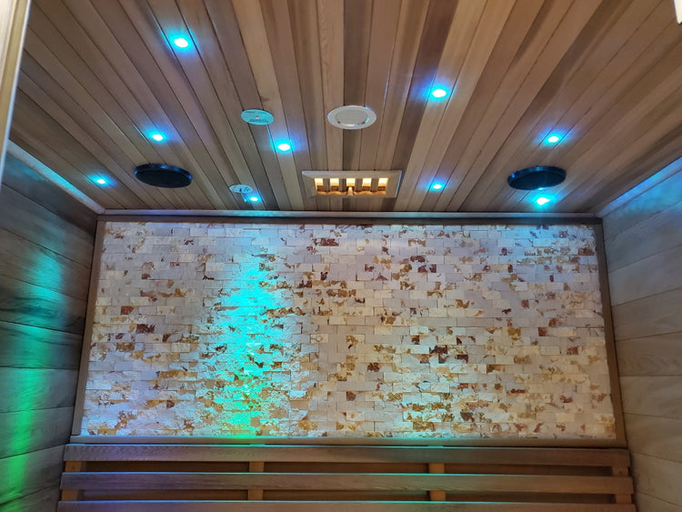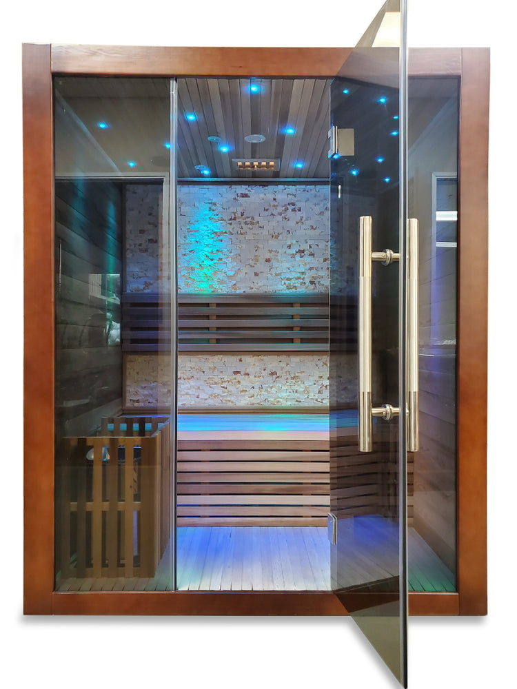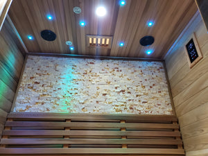 Comes complete with water bucket, ladle, sand timer, Powerful 6KW Harvia heater, rocks, bluetooth equipped digital control panel, built in bluetooth sound system, full color LED star ceiling lighting! High 200F temps are perfect for detox, weight loss, and many other health benefits! With the Upgraded Harvia 6KW Heater will heat up faster and get much hotter than many others.