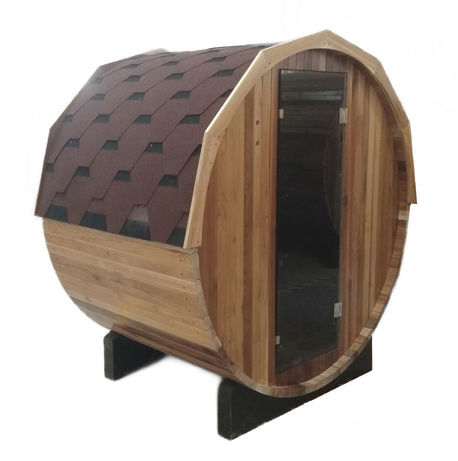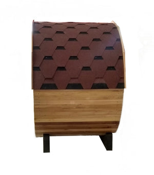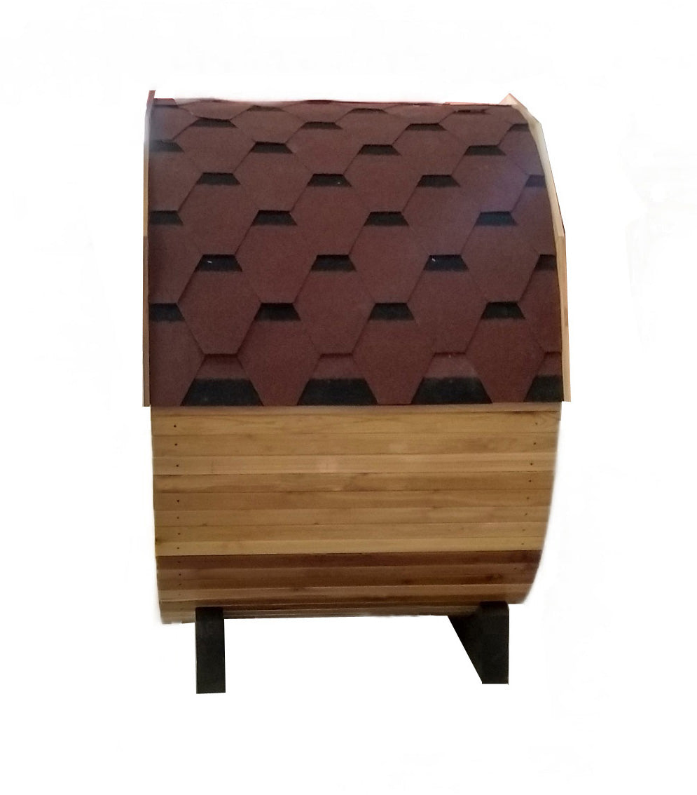 Complete kit with headrests, footrests, backrests, waterproof light, shingled roof kit, water bucket, spoon, thermometer, and sand timer! This compact 6' diameter x 4' long model is perfect for backyards with limited space. Sauna kit comes new in box and includes the shingled roof kit and tons of extras.